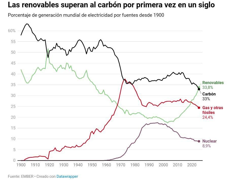 La generación eléctrica con renovables supera al carbón por primera vez en la historia. El auge de la solar frenó el aumento de la generación eléctrica global mediante combustibles fósiles en 2025. El año pasado, la generación renovable (viento, sol e hidroeléctrica) superó al carbón por primera vez en la historia y el crecimiento sin precedentes de la solar permitió a esta fuente y a la eólica cubrir el 99% del aumento de la demanda a escala mundial.