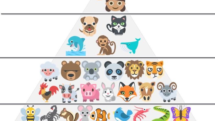 En primer lugar, conviene subrayar que prácticamente la totalidad de estos animales se representan supeditados a la especie humana, en una concepción genesíaca -para nuestro uso y disfrute- que sigue punto por punto la pirámide de la consideración moral especista. Así, los perros y gatos son más importantes para nosotros que los mal llamados animales de granja, la mayoría mamíferos, y a su vez, éstos son más importantes que las aves, los peces, los anfibios, los reptiles, los artrópodos, los moluscos y los cnidarios.