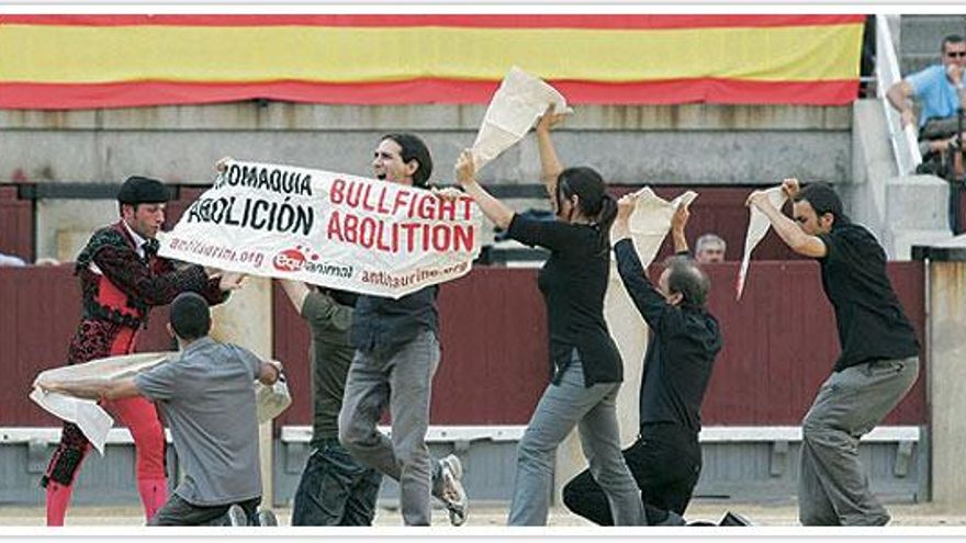 O quizás estaban protestando contra la tauromaquia, como ocurrió más de un siglo después. El 4 de mayo de 2008 seis activistas de la Fundación Equanimal saltaron al ruedo de la tristemente más importante plaza de toros del mundo, Las Ventas, desplegando pancartas para pedir de manera pacífica la abolición de la tauromaquia. Al ejercer una resistencia pasiva, fueron arrastrados por el albero impregnado de la sangre del primer toro asesinado y de la orina de los caballos, detenidos, fichados y puestos en libertad con cargos algunas horas más tarde.