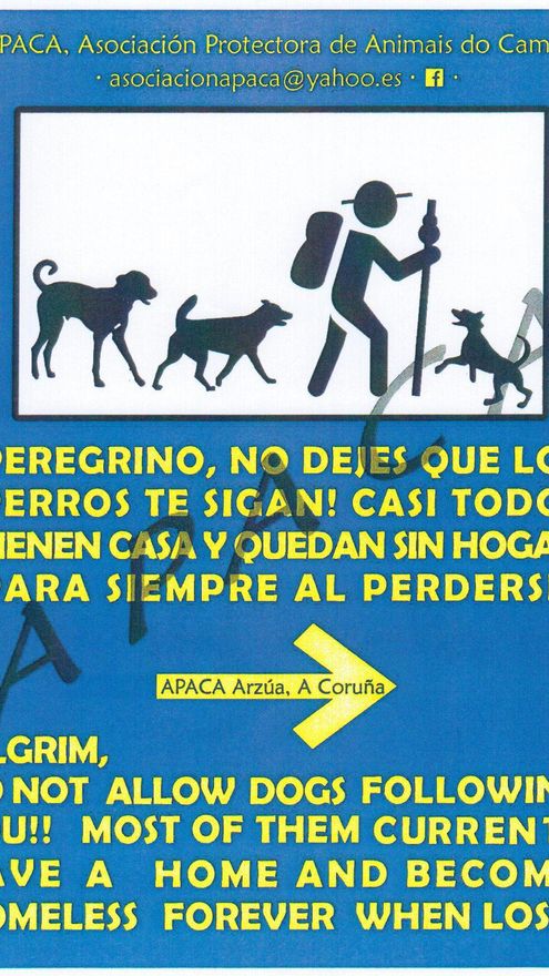 Uno de los principales problemas a los que se enfrentan en APACA es la cantidad de animales que recogen y que realmente no están abandonados. “Siempre llevamos un lector de chip en el coche, y es una alegría si llegamos y vemos que tiene identificador es una alegría. Contactamos con los dueños y los llevamos a un lugar seguro hasta que vienen a por ellos”, comenta María, consciente de que a quien no haya vivido la Galicia rural le sorprenderá que la mayoría de los perros estén sueltos por las calles de los pueblos y vuelvan de noche a su casa. Una idiosincrasia gallega que sorprende y asusta a muchos peregrinos, que o bien se preocupan por el bienestar del animal o bien tienen miedo de que los perros se acerquen demasiado a ellos. Por eso, desde APACA han lanzado una campaña para pedir a los peregrinos que sean responsables y no alimenten a los animales. “Les dan cariño o alimento y ellos se van con los peregrinos. Muchas veces se desorientan y no saben volver”. Lo que acaba generando un nuevo problema. Por eso les piden que “no permitan que el animal vaya con ellos, pero si acaba yendo con ellos, que llamen a las autoridades”. O que lo adopten, una vez confirmado que se trata de un perro abandonado.