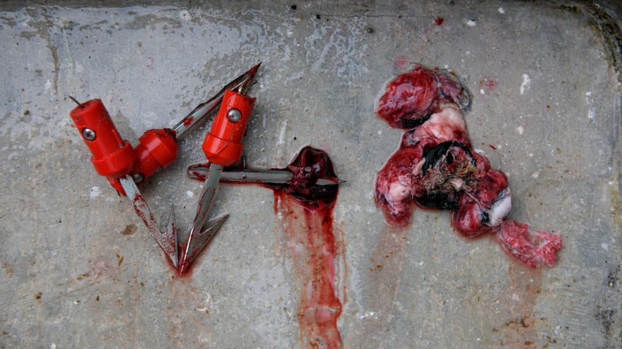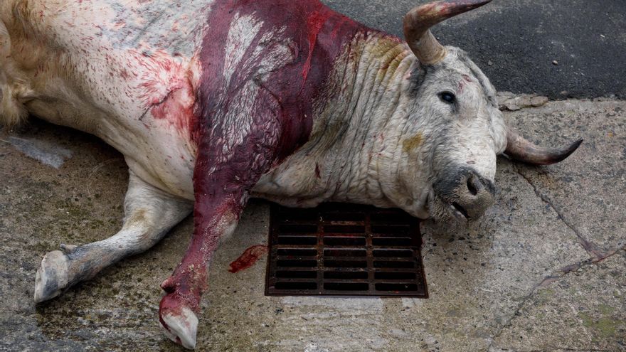 El verano pasado en este mismo blog publicamos un reportaje gráfico titulado 'La matanza de toros de los Sanfermines en 15 imágenes'. Todas ellas mostraban la realidad de esa fiesta más allá de los encierros: el gesto de pánico y dolor del toro durante la lidia, el torero exhibiendo la sangre en su traje, los caballos con los ojos tapados para no ver el riesgo de embestida ni la posible huida, y los toros, ya sin vida tras la tortura, fuera del ruedo, siendo desangrados y desollados, arrastrados y colgados de una pata por una grúa como si fueran enormes sacos para terminar de exprimir sus cuerpos.
