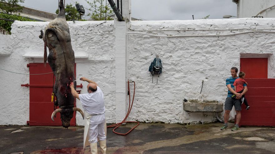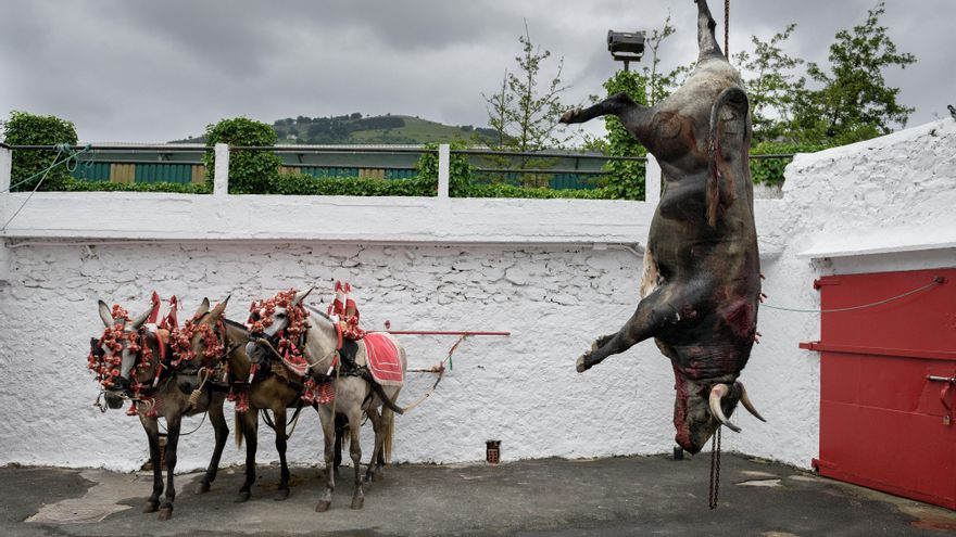 Durante las fiestas de San Ignacio en Azpeitia (Gipuzkoa), Tras Los Muros y Askekintza han documentado lo que ocurre tras la lidia, cuando los toros son desangrados y desollados en la trastienda.
