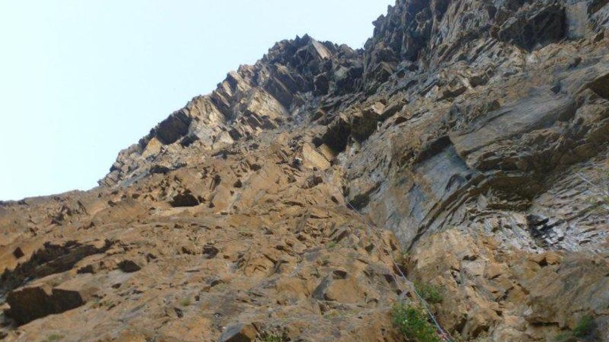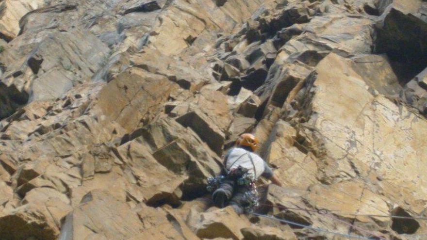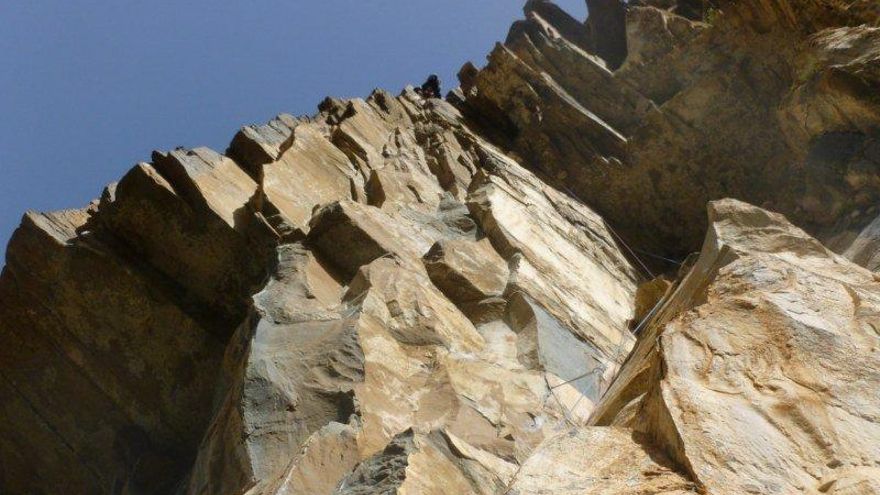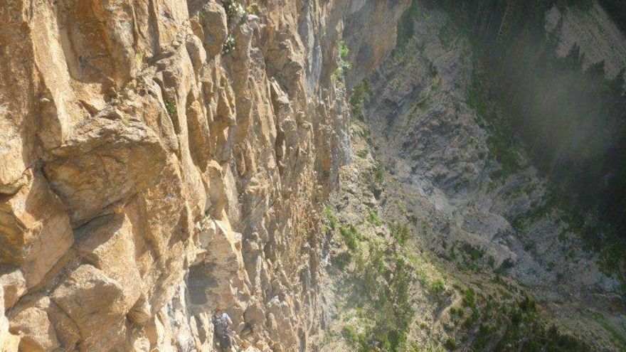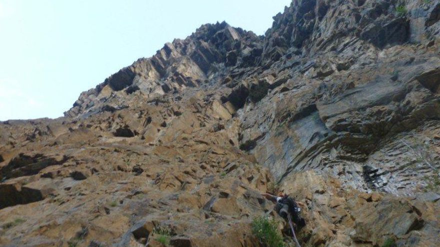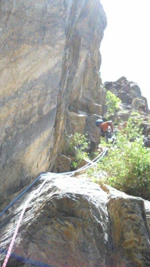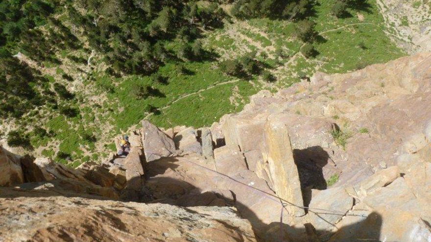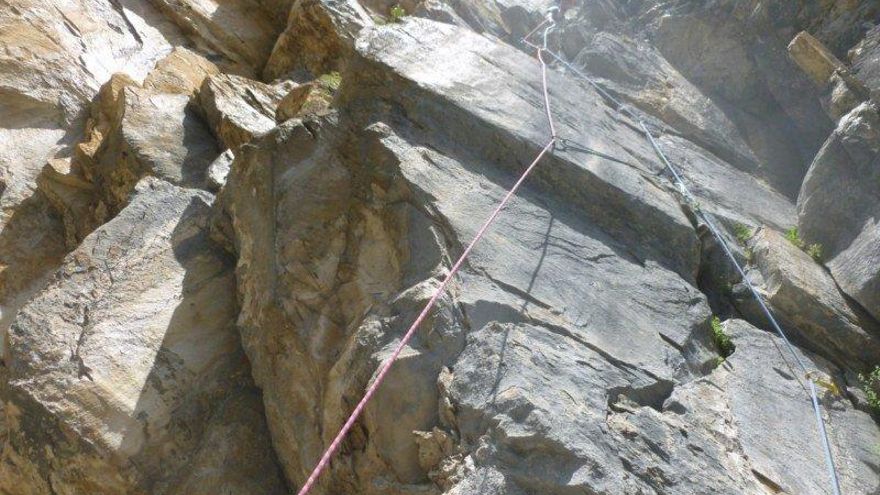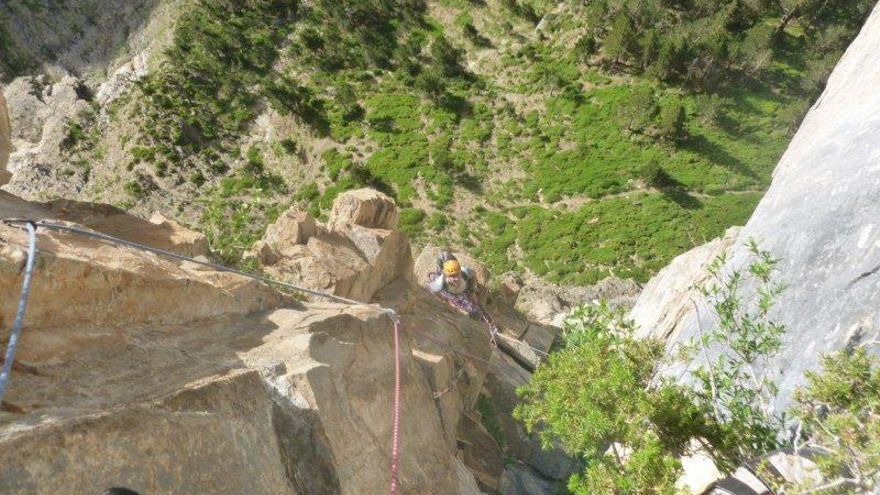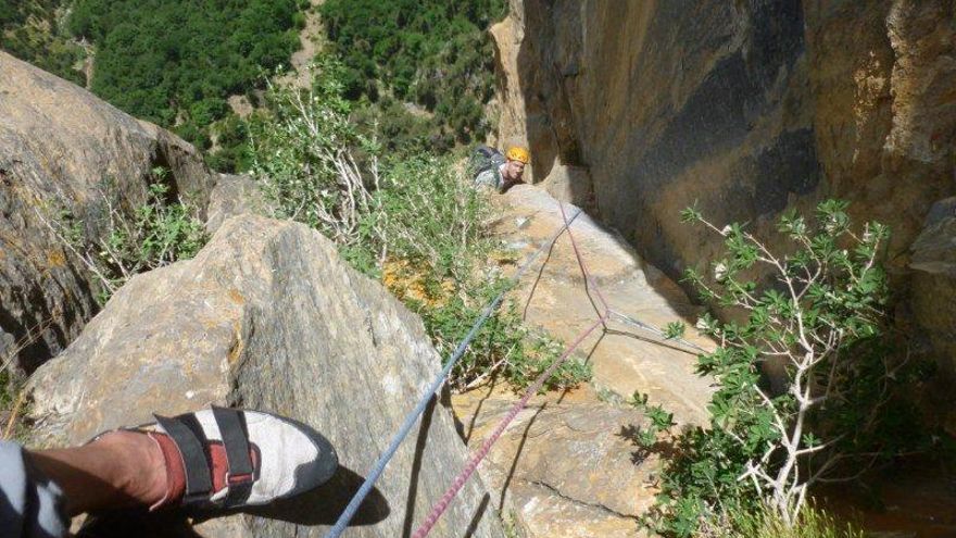 Joder, es que según te vas acercando a pie de vía, no te puedes imaginar como estos 2 adelantados de su época, tenían los santos cojones de meterse allí con 100 clavijas, unos tacos de madera, un par de mazas, unas alpargatas y una cuerda cáñamo