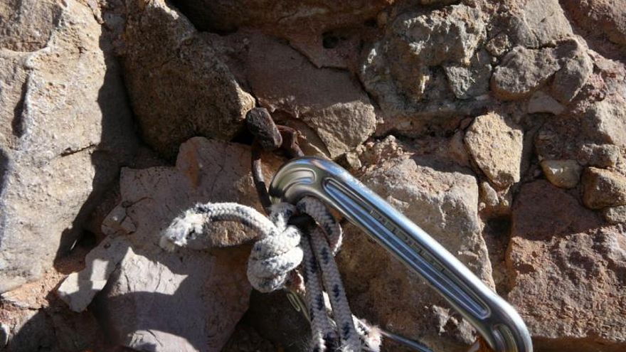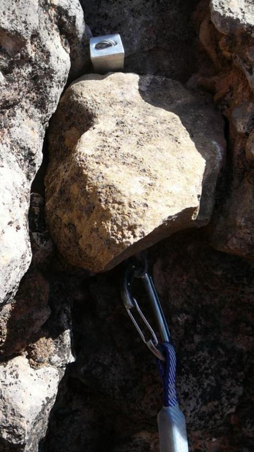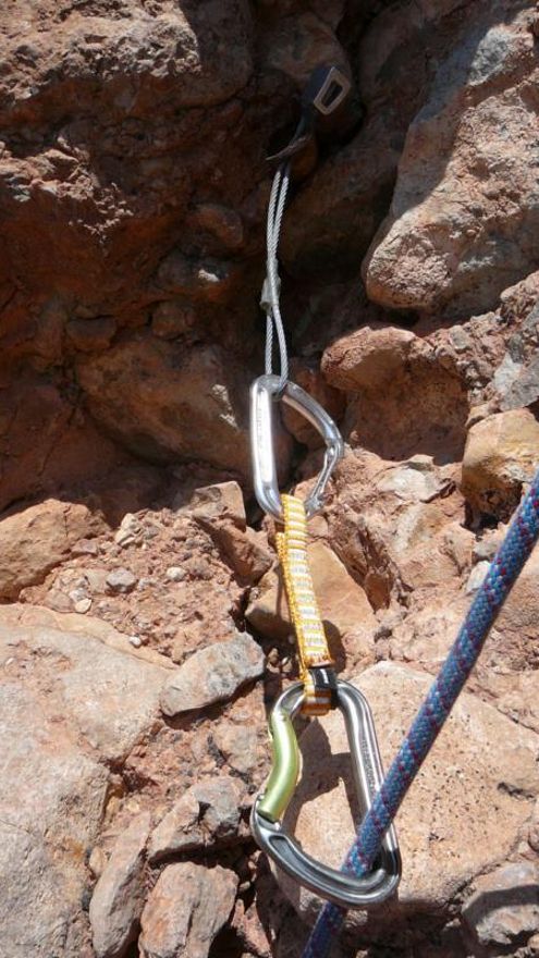 A base de artesanía me desplazo por la derecha hasta una entosta donde consigo colocar un buen clavo, continuo pero al no ver nada regreso hasta el clavo, cansado de tanto peso y recupero a mi compañero......