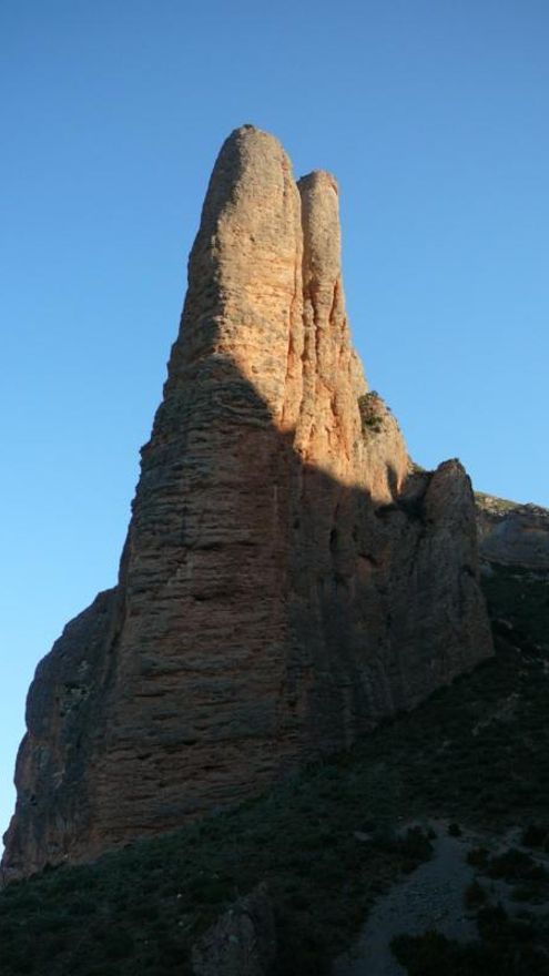 Y a las 8, salimos de Jaca, encontrándonos una hora y pioco después en la base de los impresionantes Mallos de Riglos, concretamente, bajo el Fire
