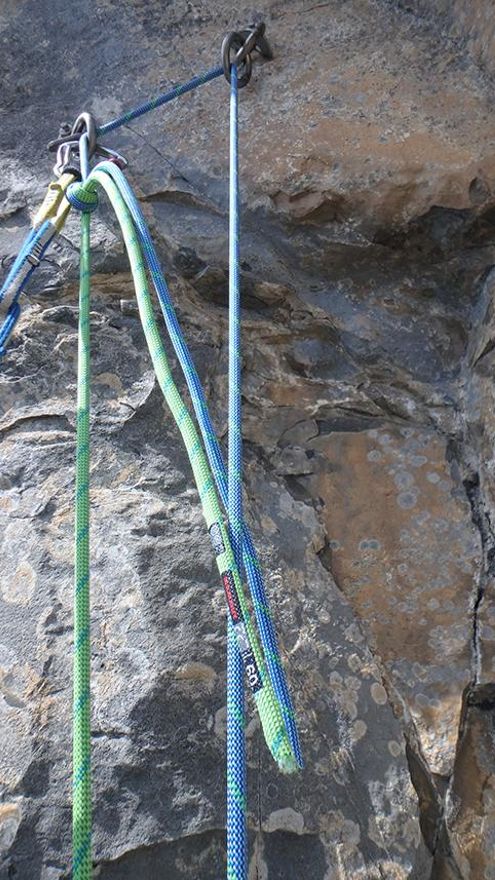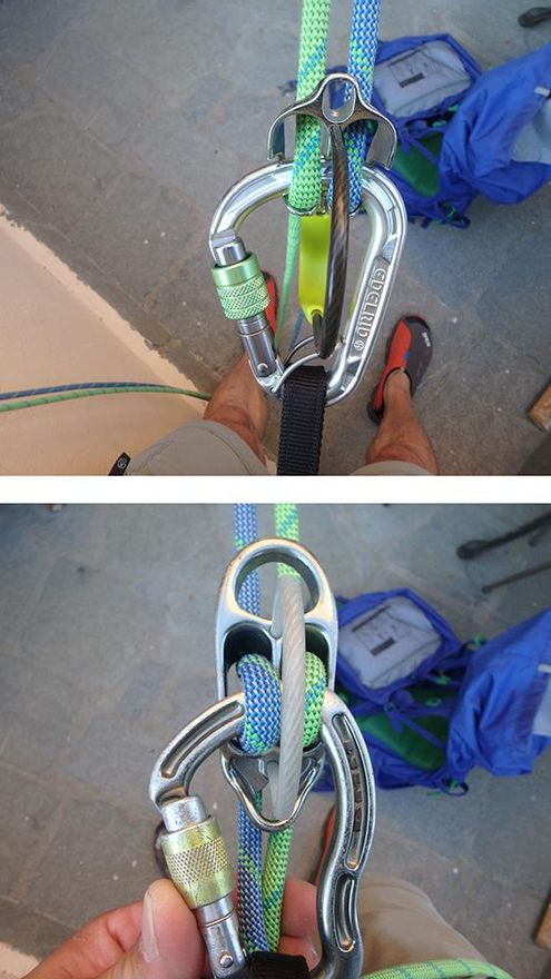 Así mismo, como a la hora de asegurar, hemos usado los mismos aparatos, con el mismo resultado, para rapelar. A la hora de usar un cordino para garantizar la seguridad en caso de pérdida de control, o tener que parar en el transcurso del rápel, hemos constatado varias cosas. Si usamos uno grueso, de 7mm o más, hay que dar un par de vueltas extras para que el bloqueo sea efectivo. Con uno de 5-6mm, frena con cinco vueltas a la perfección. El Shunt no está homologado para diámetros inferiores a los 8mm, con lo cual, ni lo hemos probado para no entrar en polémicas.
