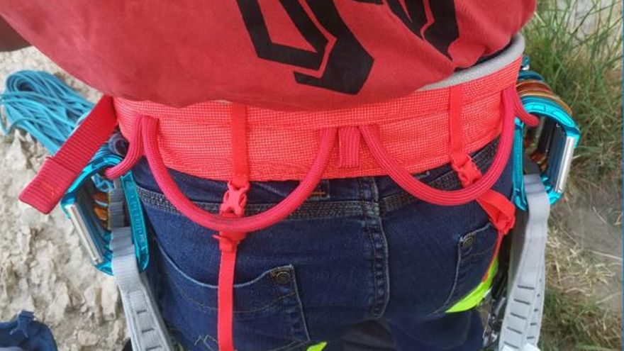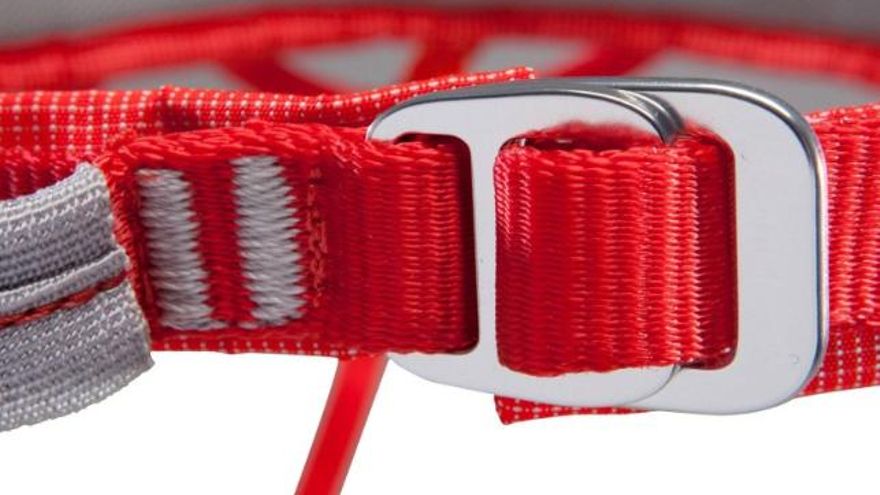La cintura está constituida por dos bandas, una superior y otra inferior, con una espuma de polietileno de alta densidad. Es un arnés cómodo para el peso y concepto del mismo, lo único que hemos notado es cierta molestia en la parte delantera de las perneras tras sufrir una caída o detenerla debido a su estrechez y rigidez.
