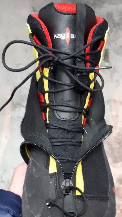Nada más ver la bota, negra como el tizón, aderezada con unos llamativos rojo y amarillo, y el nombre de la marca Kayland en grande, se aprecia que es una joya de gran calidad. La confección es exquisita. Por ahora, pese a tener bastantes costuras, no hemos podido constatar ningún desgaste. Quizás la única pega que le hemos podido sacar es la falta de termosellado en ellas. Pero también es cierto que no ha entrado nada de agua cuando le ha caído encima.
