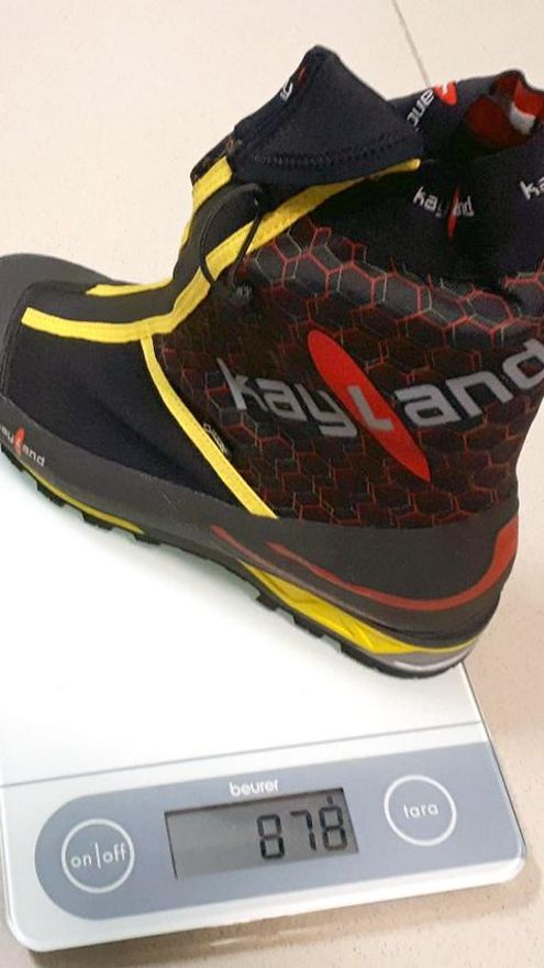 En cuanto a su uso escalando, decir que la Kayland 4001 GTX es perfectamente cramponable y de suela rígida, ideal para escalar con los crampones en nieve, hielo o en roca. Es una bota con polaina incluida muy ligera, 878 gramos en talla 44, como hemos podido comprobar en balanza, que hará que nos cansemos menos que con unas botas de la misma categoría en terreno vertical. La precisión es muy buena, al ser muy ligera y relativamente fina, y escalando en roca nos deja cantear bien. Para escalar hielo vertical, la bota deja bajar bien el talón.