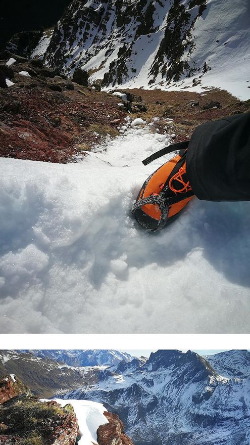 La suela, Michelin® Alpine Lite 3970|Poro Wedge, me ha sorprendido gratamente. Es la primera vez que pruebo suelas Michelin y ahora entiendo por qué la prestigiosa marca de neumáticos ha entrado en el mundo de la montaña por la puerta grande. Poseen, sin duda, un gran agarre en todas las condiciones, incluso de humedad. En los tramos de escalada se han comportado de forma increíble.