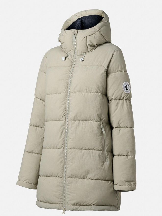 El tejido exterior es ligero, pero resistente, con tratamiento repelente al agua libre de PFC. El peso total se sitúa en torno a los 700–750 gramos, una cifra equilibrada para una parka larga y cálida.
