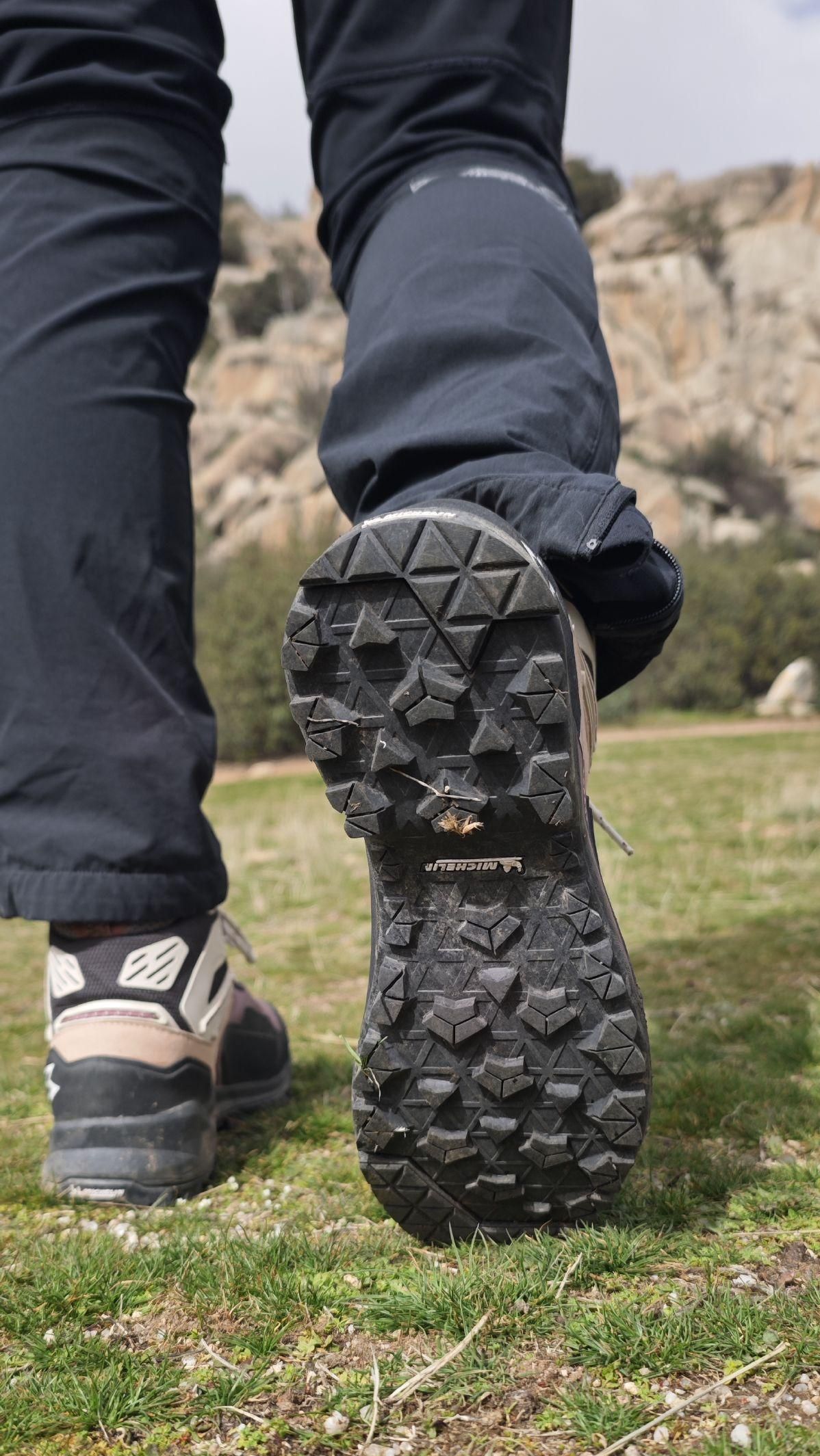 Uno de los puntos que más nos ha sorprendido sobre el terreno es la suela Michelin Off-Road. En papel promete mucho, pero lo importante es lo que ocurre en la roca. En granito seco ya funciona bien, pero donde realmente sorprende es en granito mojado, donde el agarre resulta muy superior al de muchas botas de trekking del mismo segmento. La tracción en roca inclinada, raíces húmedas o senderos embarrados transmite mucha confianza. Para una bota tan ligera, el rendimiento de la suela es sencillamente excelente.