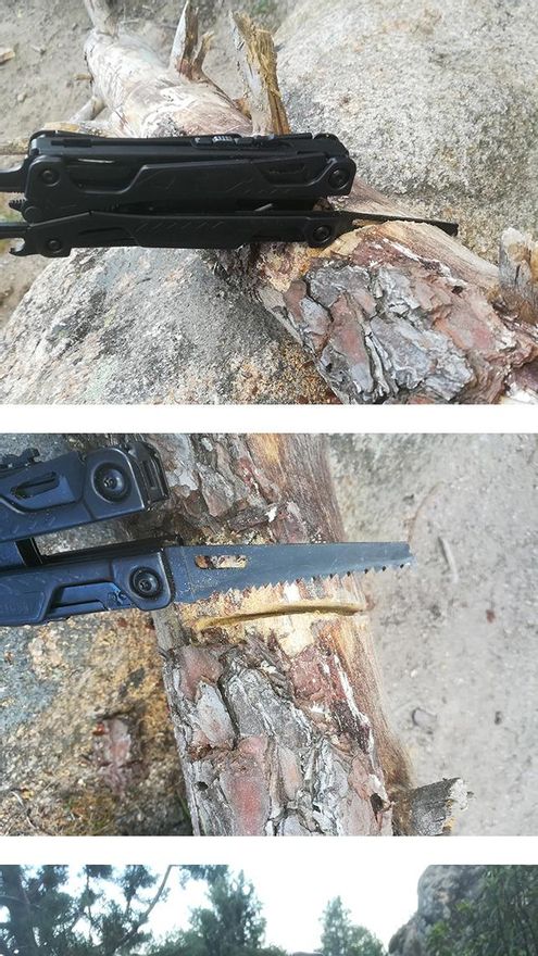 7. Sierra. Esta opción nos ha sorprendido ya que es una herramienta brutal que nos ha permitido serrar troncos de un grosor de más de 10cm de diámetro con una facilidad asombroso… y sin tener que parar a limpiarla gracias a su diseño que evacua los restos de forma rápida y automática.