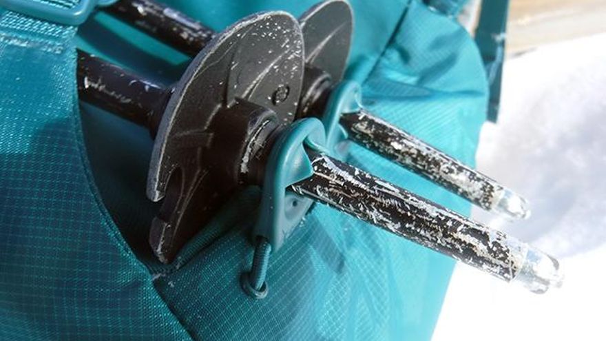 En su exterior, a parte de todos los bolsillos que hemos comentado, encontraremos cinchas compresoras que podremos usar como porta esquís. Apuntar que no nos han dejado transportar un aislante, pero es algo que si podremos colocarlo en su parte frontal gracias a las gomas elásticas que lleva. También dispone de un doble porta piolets que hemos probado con diversos modelos, encajando todos perfectamente.