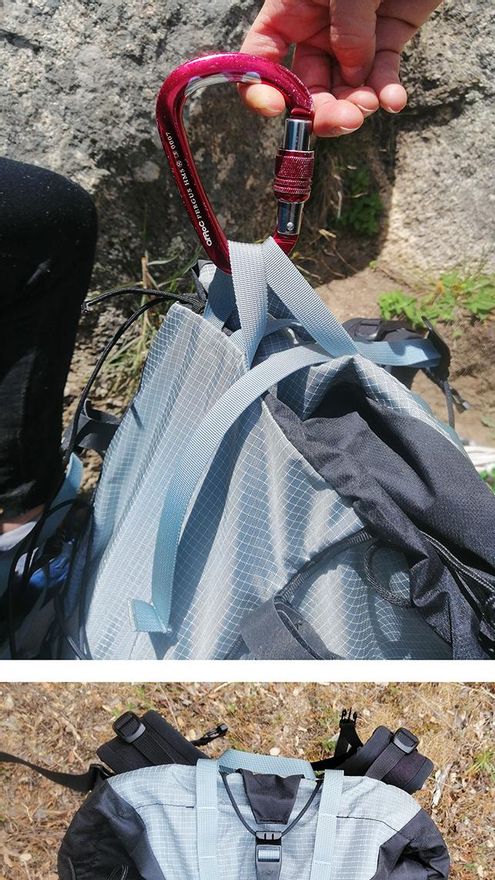 En su parte superior, un par de aros cosidos y muy recios nos permiten izar la mochila con facilidad y seguridad.