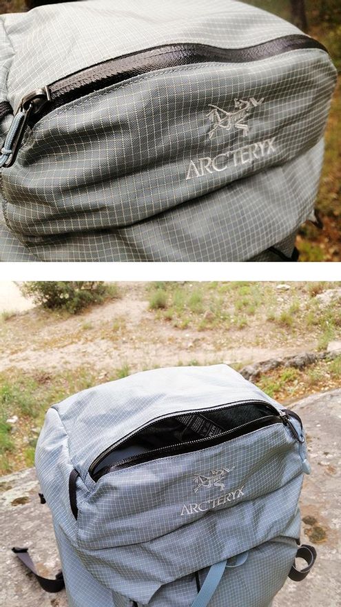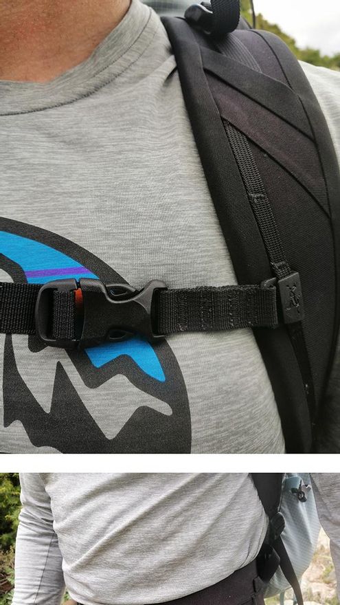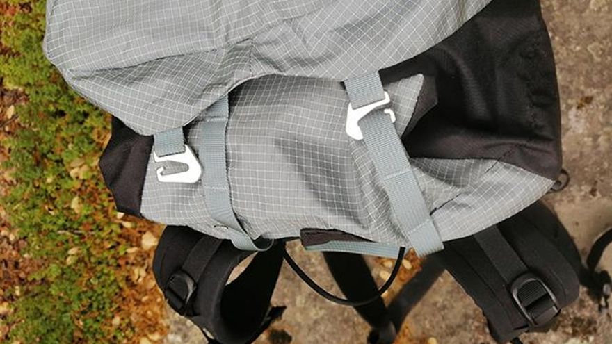 En esta ocasión, Arc´teryx ha huido de los sistemas tradicionales de click para los distintos enganches de la mochila, y ha pasado a utilizar un par de ganchos metálicos para conectar la seta con el cuerpo principal, y en la parte de los tiradores, cordino de kevlar. Esto último se repite en la cinta de ajuste donde podemos colocar la cuerda.