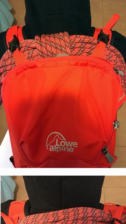 Otro detalle interesante es el sistema para el transporte de la cuerda, exclusivo de la marca Lowe Alpine, y que consiste en unos tensores en las hombreras los cuales llevan unos clips que permiten fijarla, siendo posible el transporte o parar a descansar dejándola en el suelo sin que se mueva. A su vez, sin quitarnos la mochila, podemos acceder a la cuerda fácil y rápidamente, para un paso difícil que hay que asegurar, por ejemplo, simplemente soltando los clips.