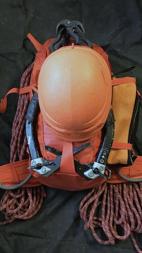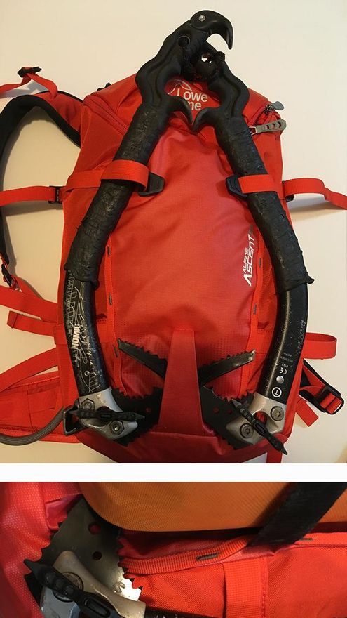 Otro detalle curioso que nos puede interesar es que cuenta con dos colgadores. Uno exterior para que nos la quitemos en las reuniones y poder fijarla, descansando la espalda, o para izarla con una cuerda auxiliar lo que nos permitirá escalar más ligeros de segundo. Y otro interior para que podamos abrirla cuando lleguemos a pie de corredor, el cual suele estar helado y tiene bastante inclinación, con lo que hay que hacer malabares con las piernas para que no corra ladera abajo. Este sistema, tomando precaución de sacar las cosas con cuidado, es más seguro, tanto para la mochila, como para el escalador.