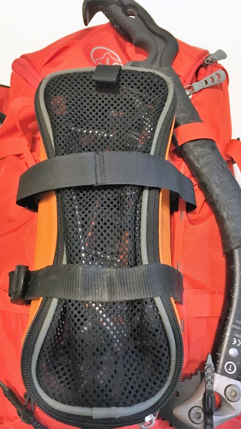 Vemos otros dos bolsillos laterales de varillas en los que también se puede guardar material de rápido acceso tipo pala, sonda, bastones, etc., aunque hay que tener cuidado que metemos ahí ya que están abiertos por un lateral.