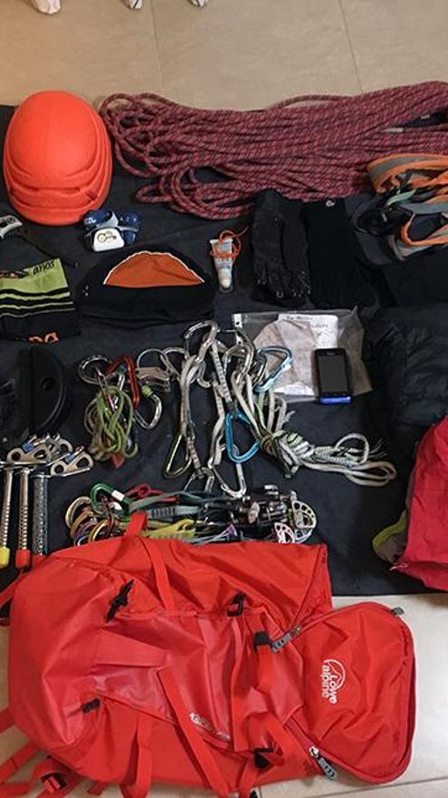 En nuestro caso, por dar un ejemplo, para una actividad de un día en un corredor en Pirineos, o para Alpes también se aplicaría, para una cordada formada por dos, llevamos el siguiente material: