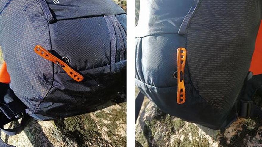 El sistema de sujeción para los piolets es el típico de la marca, con dos trabillas de metal con elástico abajo que se meten por dentro del ojal del piolet, y una cinta regulada por tanka para la parte del mango del mismo. Éste es un sistema que nos gusta mucho por su facilidad y rapidez de manejo para con las herramientas.