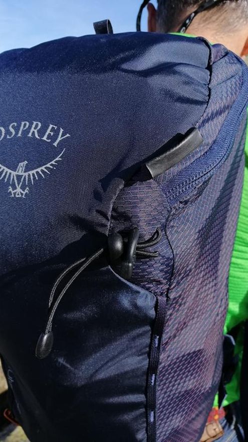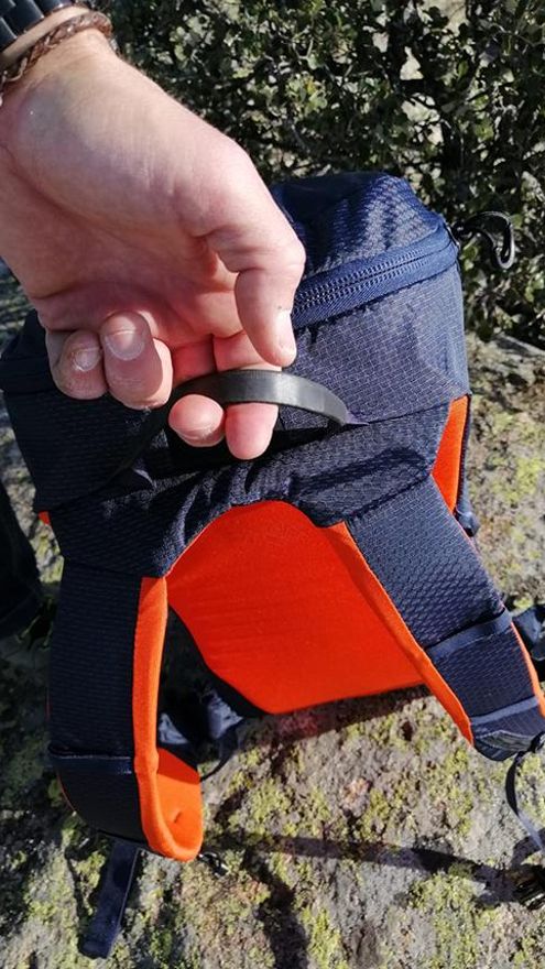 También tiene tres anillos muy reforzados, uno en la nuca y dos en la parte superior frontal de la mochila que nos permiten izarla con facilidad y seguridad o colgar elementos como el casco.