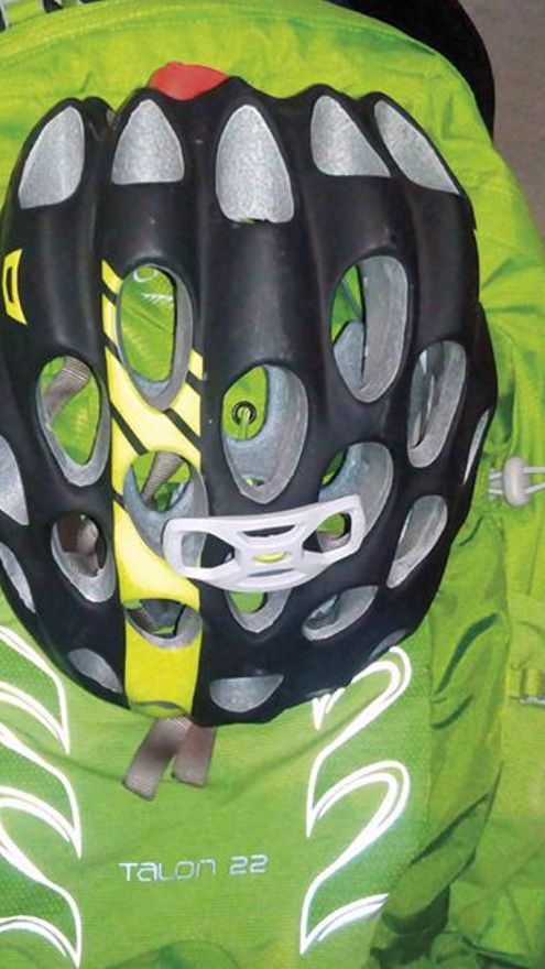 Un detalle que cuesta sacarle su aplicación si no lo conocemos es una pieza plástica que encontramos en el frontal en la parte superior. Si observamos la foto adjunta, se trata de una especie de fijador para el casco. En la marca lo ponen para casco de bici, pero en los cascos de escalada con aberturas de aireación se puede fijar exactamente igual.