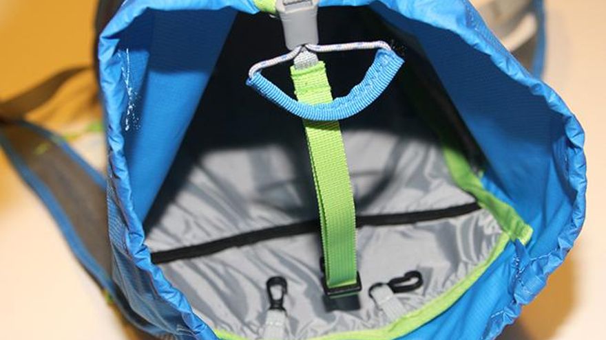 En el interior del volumen central encontramos un compartimento para colgar la bolsa de hidratación de dos ganchos, así como una apertura central muy disimulada ya que lo tapa la cinta para colgar la mochila por la que sacar el tubo al exterior.