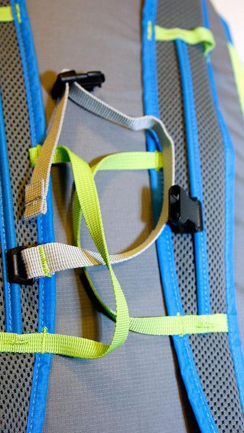 Se realiza mediante unas correas finas y ligeras desmontables que podemos ajustar cómodamente para que no se mueva la mochila, o quitarlas si preferimos prescindir de ellas.