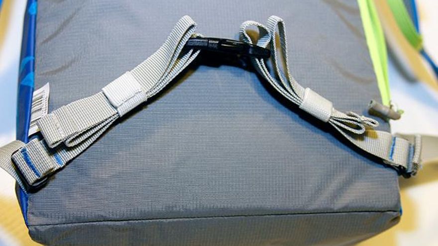 Los tirantes de “mesh” le aportan ligereza y tienen el ancho justo para no sentir que se clave en los hombros cuando llevamos carga. Podemos ajustar en altura la correa de pecho mediante una corredera, así como regular la anchura para que los tirantes no resbalen sobre los hombros.