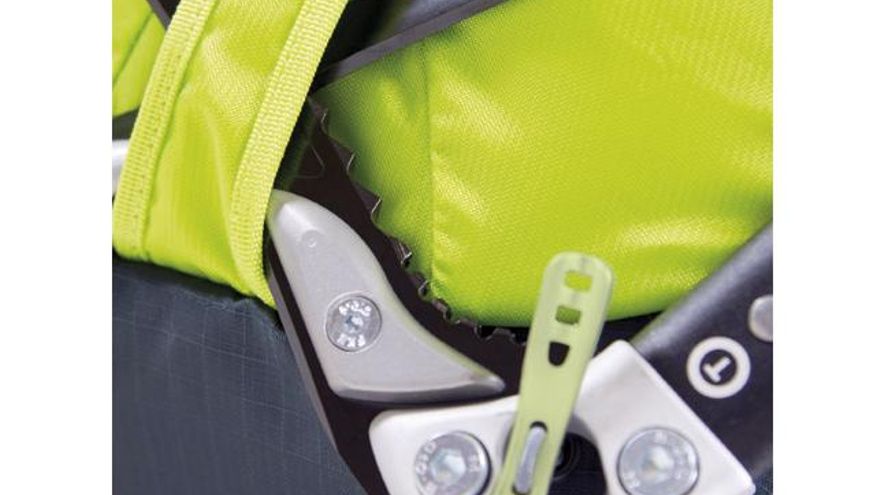 El sistema de ajuste de piolets también nos ha gustado mucho, ya que es rápido y cómodo de usar incluso con guantes, al igual que el sistema para sujetar una cuerda en la parte externa de la mochila, muy útil y efectivo.