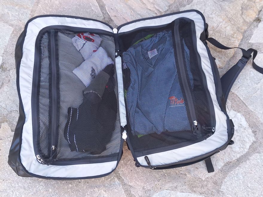 Uno de los aspectos mejor resueltos de la Squffel 44 es su apertura tipo maleta 50/50, que divide el interior en dos compartimentos simétricos, separados por paneles de malla con cremallera. Esta estructura permite organizar el equipaje por secciones y acceder al contenido sin necesidad de vaciar toda la bolsa. Esta todo pensado para que cada cosa tenga su lugar, y puedas acceder a ella sin desmontar el resto.