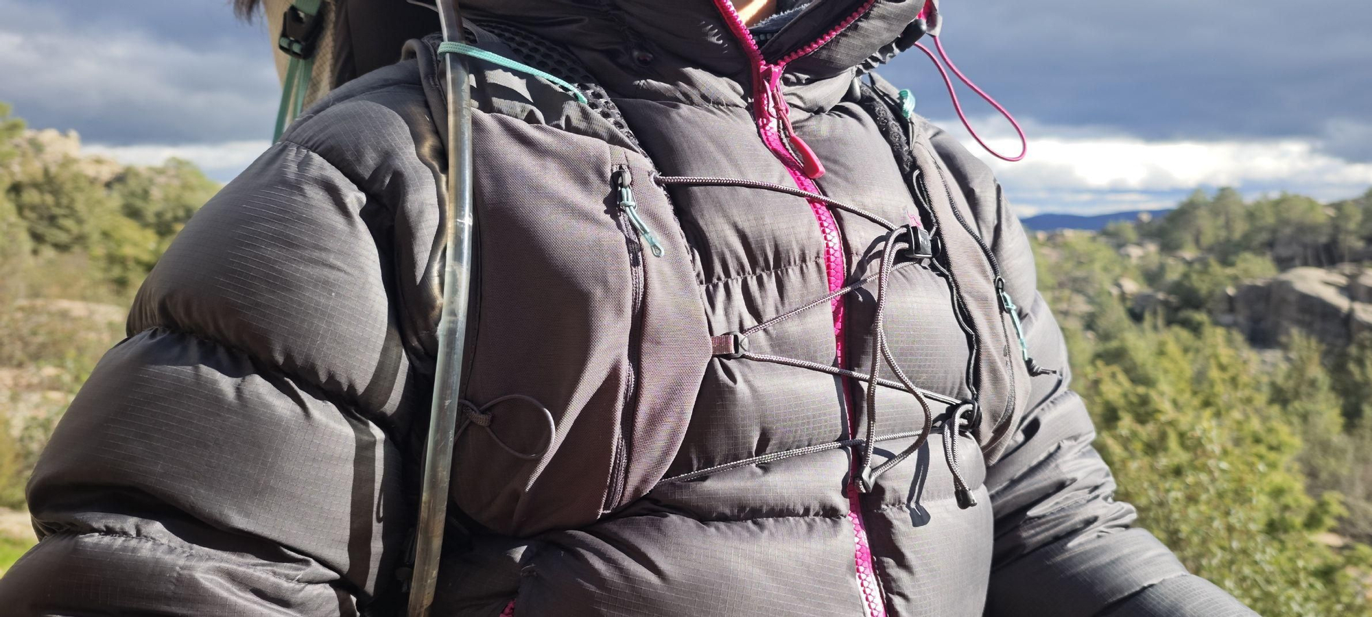 Además, el arnés incorpora dos bolsillos pectorales, algo heredado de mochilas tipo chaleco para trail running. Son perfectos para llevar comida, móvil o pequeños objetos sin tener que parar continuamente.