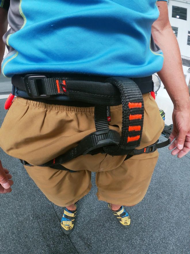El ajuste lumbar consta de una anilla lateral, y tanto el cinturón ventral como las perneras cuentan con guías para llevar el sobrante de la cinta y que no moleste durante la escalada.