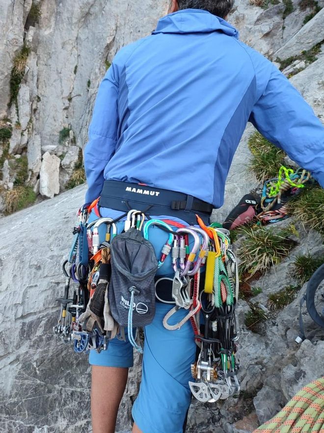 Consta de cuatro porta materiales de excelente terminación y acabado, dos de ellos, los delanteros, rígidos y más robustos, y los dos traseros, más ligeros. También presenta dos trabillas para mosquetones en el caso de que queramos portar tornillos de hielo. En general se cargan muy bien y aceptan bastante material con soltura y comodidad.
