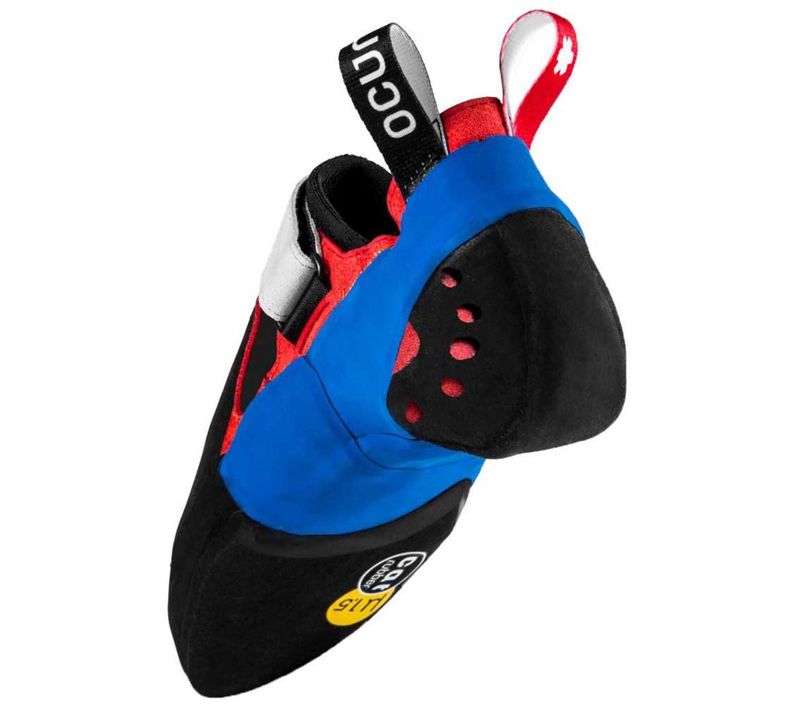 La suela que utiliza es una CAT rubber 1.5, 4mm que nos ha dado un magnífico resultado en caliza teniendo muy buena adherencia. Es una suela muy blanda por lo que en granito nos ha funcionado peor ya que se deterioda con rapidez y en placas muy duras no nos transmite las mismas buenas sensaciones que en caliza. Aunque insistimos que en el computo general, es una buena suela con un funcionamiento mucho más que correcto y que en vías o bloques de dificultad de caliza, va perfecta.
