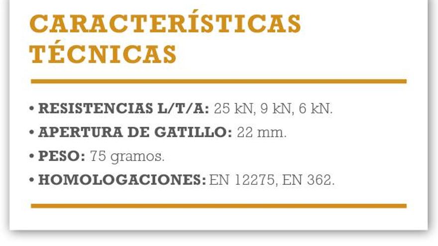 El punto a favor del mosquetón, sin duda, es la apertura del gatillo, la mayor del test, compartida solo por algún que otro modelo. Hablamos de 22mm. Una apertura más que suficiente en un mosquetón de estas características que nos permitirá trabajar a gusto con cuerdas de cualquier diámetro.