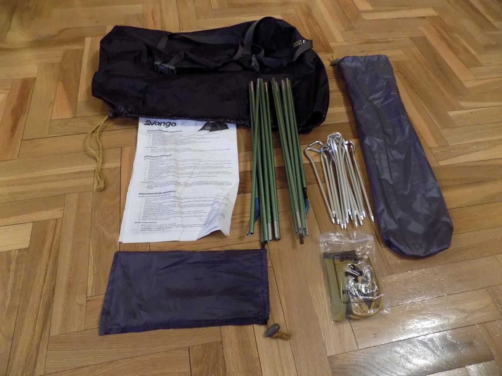 En el interior de la bolsa de transporte, la cual debemos destacar que es bastante amplia, lo que facilita su recogida de manera poco escrupulosa o mojada, cuenta con dos tensores para reducir su volumen plegada (44x17cm), además de dieciséis piquetas ligeras, lo que no la hace muy apta para emplazamientos en terreno nevado, pedreras o arenoso. Contamos también con un pequeño kit de reparación compuesto por un viento de tejido algo mejorable, dos gomas y parches.