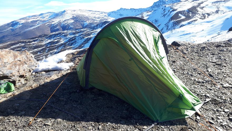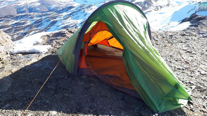 La estructura de la tienda, tipo “túnel”, es perfecta para poder aguantar con sencillez vientos de montaña fuertes. El no tener una estructura interna que nos obstaculice la habitabilidad es una gran ventaja para una tienda de estas dimensiones.