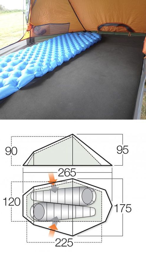 Quizás sea el aspecto más ajustado de esta tienda de campaña. Está tan apurada y aprovechada, para ajustar piezas y peso, que no sobra el sitio. Justa para dos personas, si son de tamaño grande dormirán apretadas. La forma de dormir es del tipo “cabeza-pies”, para optimar el espacio. No hay ábside como tal, pero sí que hay cierto espacio entre las puertas interiores y exteriores, donde podremos guardar las mochilas una vez vacías, o casi. Dispone de cuatro