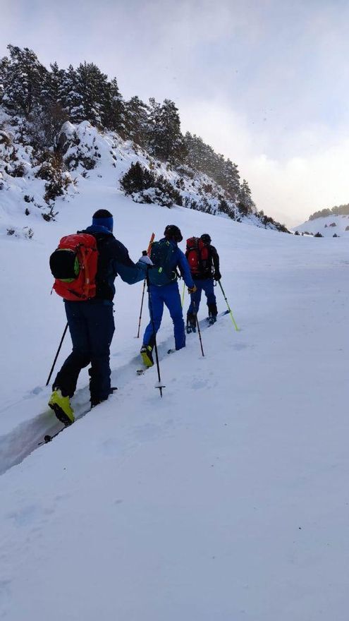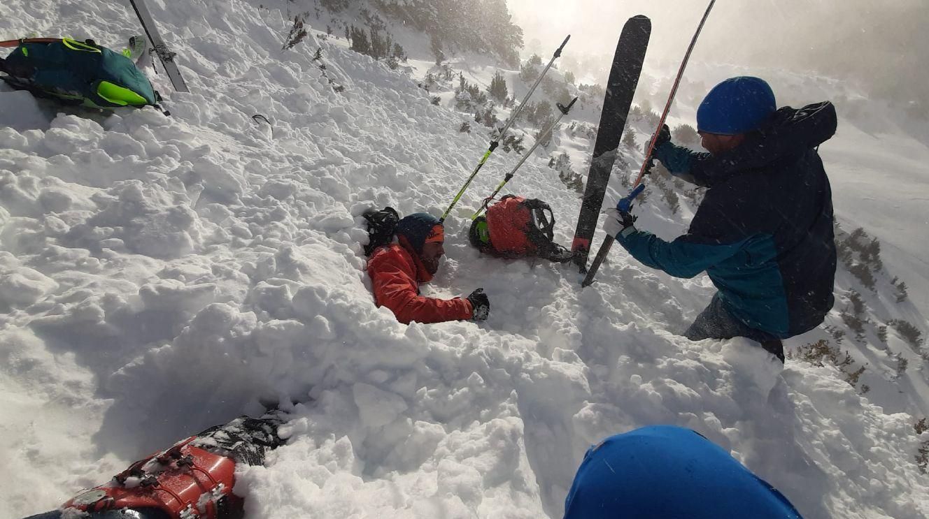 - Tercero. Adriano: “cuando veo que rompe la placa y me pilla la ola, intento girarme hacia la pendiente para escapar, pero me empuja muy fuerte hacia abajo. Voy haciendo toda la fuerza que puedo hacia atrás de pie, pero llega un momento que me supera la nieve por encima de la cabeza, y me tumba boca abajo. Los bastones hace tiempo que los tiré al llevarlos en una mano. En un acto reflejo del ”susto“ al volcar aplastado hacia delante, creo que abro la boca por la sorpresa, y se me llena de nieve. Me saco con los dedos la nieve de la boca, y me intento hacer una piña con los brazos rodeando la cabeza con los codos tapando boca y nariz. Solo pienso en que espero no caer bajo el talud del fin de la pendiente, quedando bajo el depósito de nieve. Cuando paro entre unos bojs, durante unos segundos la nieve sigue pasándome por encima, hasta que gracias a eso, me libera casi completamente, excepto piernas. Me pongo a gritar a ver quién me responde. Oigo a Coni de lejos, y veo arriba una cabeza entre la nieve. En segundos me confirma que todos controlados. Al ser nieve muy poco densa, me escapo rápido, y voy a toda leche a donde está Salvador semienterrado”.