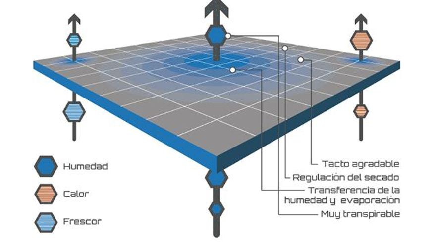 •Transporte superior de la humedad al exterior. Los hilos hidrófobos prolongan la respuesta natural de la piel y su efecto refrescante al evaporar el sudor