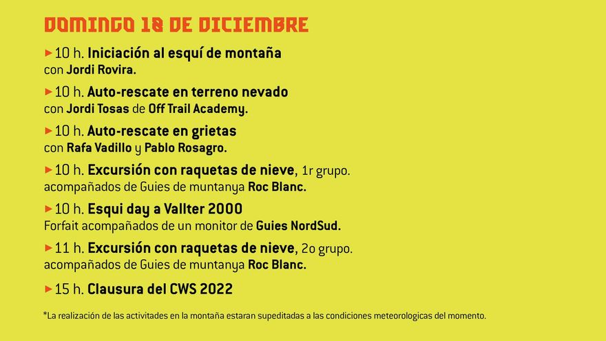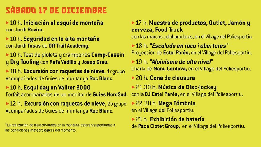 Durante el fin de semana se podrá disfrutar de la escalada en hielo y el dry tooling con Rafa Vadillo y Josep Grau, excursiones con raquetas de nieve a cargo de la compañía de guías de montaña Roc Blanc, esquí fuera pista con los guías Nord -Sur, cápsulas formativas de seguridad a cargo de Jordi Tosas y el esquí de montaña con Jordi Rovira.