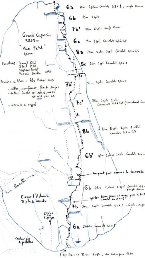 El primero en alcanzar la cima fue Arnaud Petit junto a Stephanie Bodet, Pascal Gaudin y Jean-Paul Petit en 1997 y más tarde, ocho años después para ser precisos, fue conquistada en libre por el escalador Alexander Huber. Muchos lo han intentado y no lo han conseguido, lo que la convierte en una de las caras más duras de la Grand Capucin en la región de Mont Blanc, lo que resume la importancia del éxito.