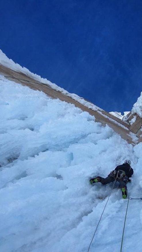 20- Terminan los rápeles hasta el collado, y comienzan Venas azules (esta ruta fue abierta por Bjørn-Eivind Årtun y Ole Lied en diciembre de 2011) hacia las 8.15am, donde escalan cinco largos y medio (se equivocaron, sólo debían escalar cuatro y atravesar a la derecha para unirse a la Ruta americana) por lo que se embarcaron ante el abundante hielo-escarcha que hacía inviable seguir por ella y tuvieron que rapelar y atravesar con más gasto de tiempo y energía hasta la Ruta americana. Primero por ella y luego desviándose más a la derecha llegan a la cumbre de la Torre Egger con las últimas luces y vivaquean unos metros por debajo de la cima.
