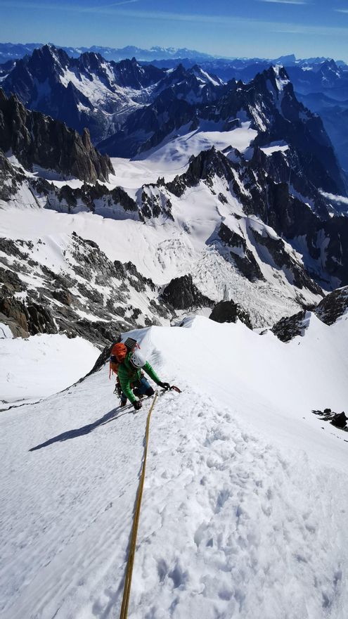 “Ayer hacíamos cumbre en el Mont Blanc (4.810 metros) por su ruta más larga, con más desnivel y quizá más exigente: la Integral de Peuterey. No íbamos a hacer esa actividad en esta ventana, pero cuando nos dimos cuenta que había cuatro días de buen tiempo, no lo dudamos. El jueves aproximamos al refugio Borelli para dormir allí. El viernes nos levantamos a las 3 de la mañana, aproximamos a la Aguja Negra, escalamos sus 1.200 metros de ruta y llegamos a las 16h a cumbre. Hicimos vivac allí porque había niebla y no queríamos rapelar con poca visibilidad. El sábado nos levantamos a las 4:30, hicimos los 16 rápeles de la Aguja Negra, cruzamos las Damas Inglesas, pasamos por el Craveri, subimos a la Aguille Blanche Norte y Sur, hicimos los seis rápeles al Collado de Peuterey y dormimos en el glaciar. Ayer, nos levantamos a las 4:30, escalamos el Grand Pillier d'Angle, hicimos todas las aristas y placas de nieve y hielo hasta el Mont Blanc de Courmayeur y 30 minutos después, a las 12:15, hicimos cumbre en el Mont Blanc. Esta mañana hemos llegado a Chamonix. Ha sido la actividad que más hemos disfrutado y que más nos ha exigido. Hay que escalar muy rápido y tener una buena logística. ¡Aventurón!”