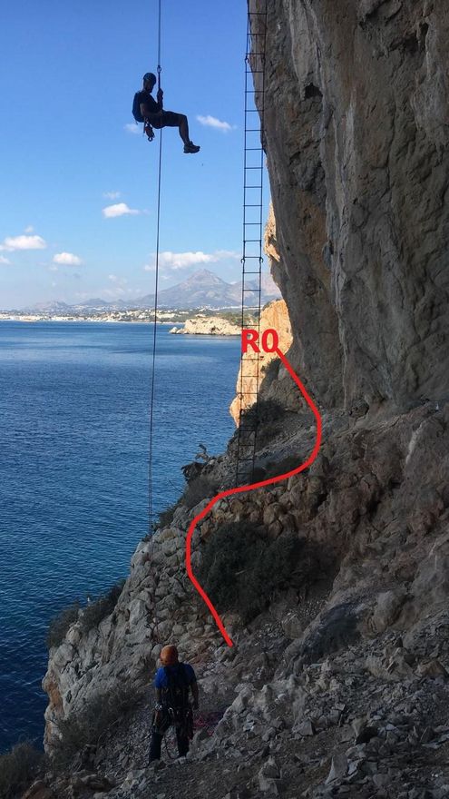 Desde el final de la calle continuamos por una pista/sendero marcado con hitos que avanza paralelo hacia el mar, y dejando el acantilado a nuestra derecha. Tras atravesar una primera vaguada, llegaremos a una segunda vaguada donde encontraremos tres parabolts con maillones y un par barras metálicas a modo de instalación, desde donde iniciaremos el rápel de descenso hacia el comienzo de la vía (unos 30 minutos).