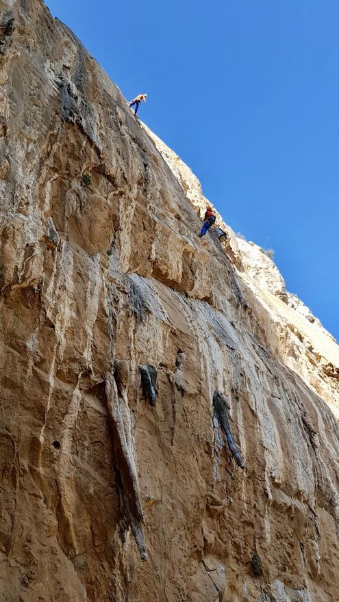 “Los dos primeros largos estaban ya abiertos en los 90, llamados 'Hierbas Letales' (6b+ y 7b, aunque creo que más bien 7b+), y era el acceso más lógico para abrir en el único recorrido evidente que queda en este precioso muro desplomado de El Chorro. Llevaba muchos años estudiando ese recorrido, pero siempre tenía mis dudas, ya que no sabía si sería demasiado duro o demasiado liso en su parte superior. En las vacaciones de diciembre busqué un hueco, al igual que Rubén, y nos lanzamos a ver que salía. Y el resultado fue 'Pandemia Letal', de 140 metros. Por largos sería así: