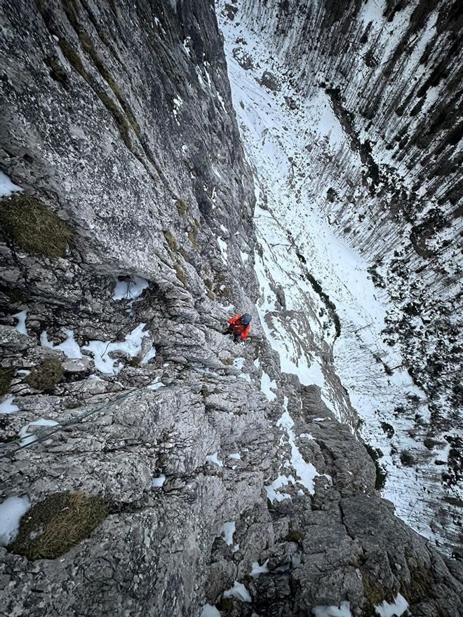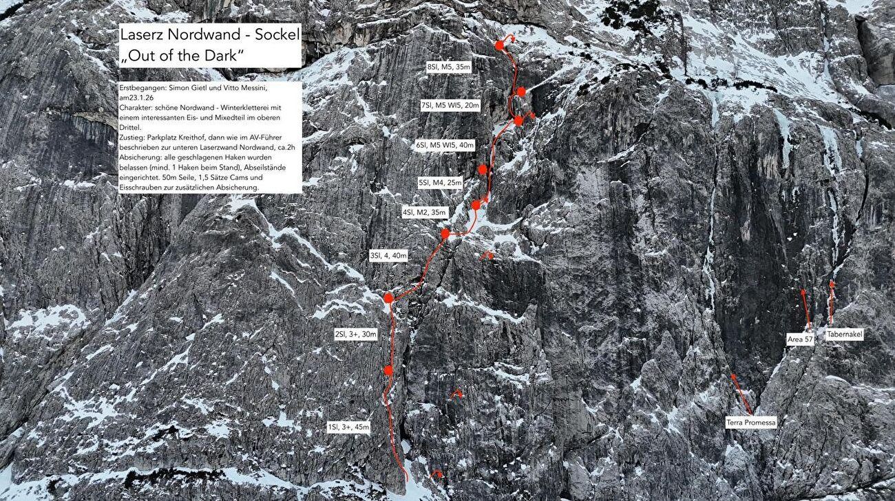 Simon Gietl y Vittorio Messini, compañeros habituales de escalada, abrieron el pasado 23 de enero una nueva ruta en la cara norte de Laserz, en Los Dolomitas de Lienz (Austria). El resultado final, que han bautizado con el nombre de Out of the Dark, es una vía mixta de unos 270 metros y 8 largos que supera dificultades de hasta M5 / Wi5, y que describen como “una escalada invernal que recorre una preciosa cara norte, con una interesante sección de hielo y mixto en el tercio superior”.