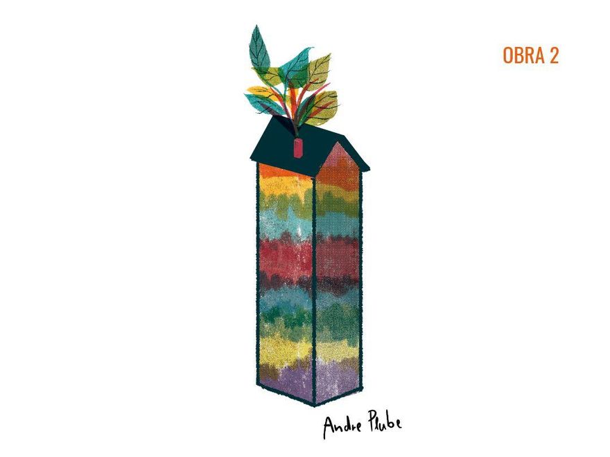 Se presentan los estratos de la tierra como una casa desde la que brotan las hojas. Nos presenta la tierra como nuestro hogar, ese lugar donde comienza la vida del ecosistema en el que convivimos.